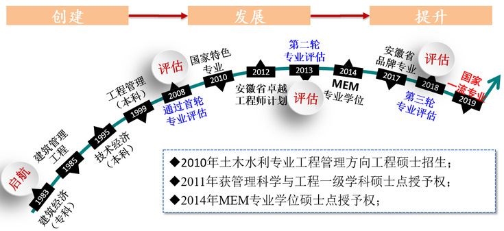 学校在安徽省高校中率先开设工程管理专业,于2000年春季开始招生,专业办学历史悠久,建设成效卓越,先后获国家级特色专业、安徽省卓越工程师教育培养计划专业、安徽省品牌专业、国家首批一流专业。连续三次以优秀结论通过住房和城乡建设部全国高等教育工程管理专业评估,也是安徽省工程管理专业最早通过专业评估认证的高校。