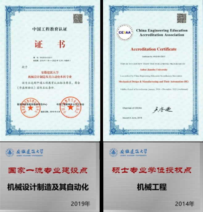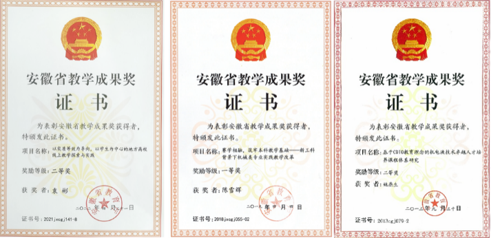 机械设计制造及其自动化专业教学团队由承担专业教学任务的教师组成,现有专业教师29人,其中教授6人,副教授(含高级实验师)11人;14人具有博士学位。本专业教学团队下设四个课程组,分别是工程机械、机械基础、先进制造技术、机电液一体化,其中机械基础教学团队获批省级教学团队。近5年来,承担国家、省、厅、校等各级各类科研教研课题60余项,发表学术论文120余篇,获得国家专利40余项,主编或参编教材6部及学术著作2部。近年来获得安徽省教学成果特等奖1项、一等奖2项、二等奖5项、三等奖8项、各类科技进步奖11项,获得省级质量工程13项。