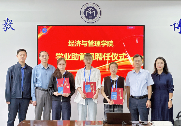 本网讯 为深入学习贯彻习近平总书记关于教育的重要论述,落实立德树人根本任务,进一步加强和改进学风建设,充分发挥榜样学生的示范引领作用。近日,经管学院在建树楼404会议室举办学业助管员聘任仪式。学院领导班子成员、全体辅导员、教学办教师及三名成功保研的“准研究生”参加仪式。仪式由学院党委副书记汪令宇主持。